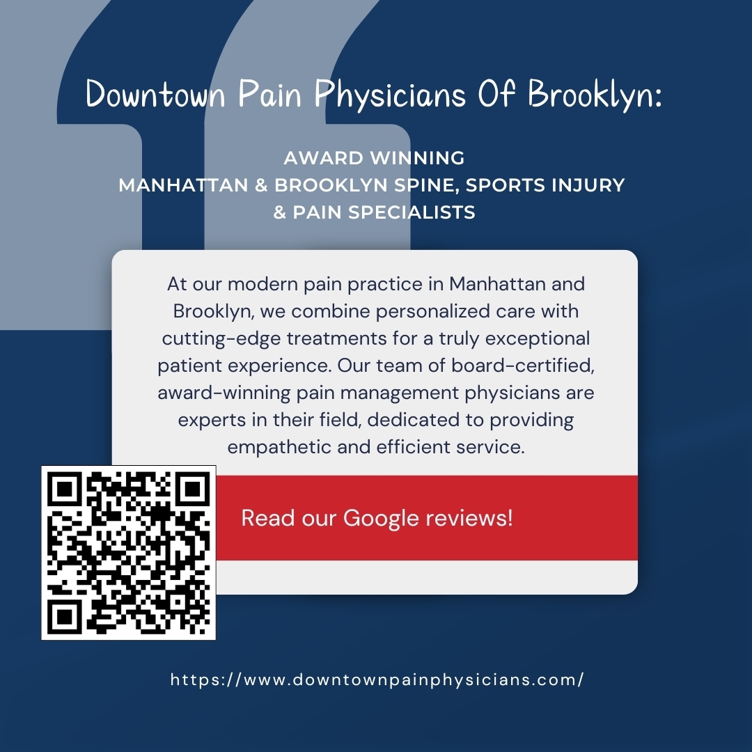 Downtown Pain Physicians is a modern, dynamic Spine & Pain Practice with locations in Manhattan and Brooklyn. The essence of our practice is focused on individualized patient care. We are obsessed with the empathetic, efficient, and convenient patient experience. Our facilities are state-of-the-art with the ability to provide cutting-edge treatments. Our pain management physicians are board-certified, award-winning and highly reviewed experts in their field.At Downtown Pain Physicians, our board-certified pain management specialists provide a full range of various pain relief treatments for patients suffering from acute and chronic pain. A team of interventional pain management doctors, anesthesiologists, and pain medicine physicians are working together to provide you with the necessary pain relief. Our doctors are trained in the most prestigious universities, including Yale University, and Columbia University, and are known as the region`s best pain management doctors. For patients in pain requiring treatment, Downtown Pain Physicians offers multiple convenient locations in Downtown Brooklyn and Lower Manhattan.